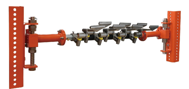 主要用于回程皮帶下表面的清掃,采用模塊化設(shè)計,由自適應(yīng)避障刮刀模組、不銹鋼304彈性雙級底座、異型橫梁、安裝架等組成。